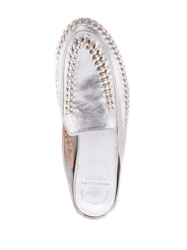 Fini métallisé, bout en amande, design tissé, design à enfiler, semelle plate en cuir. Couleur : argent.