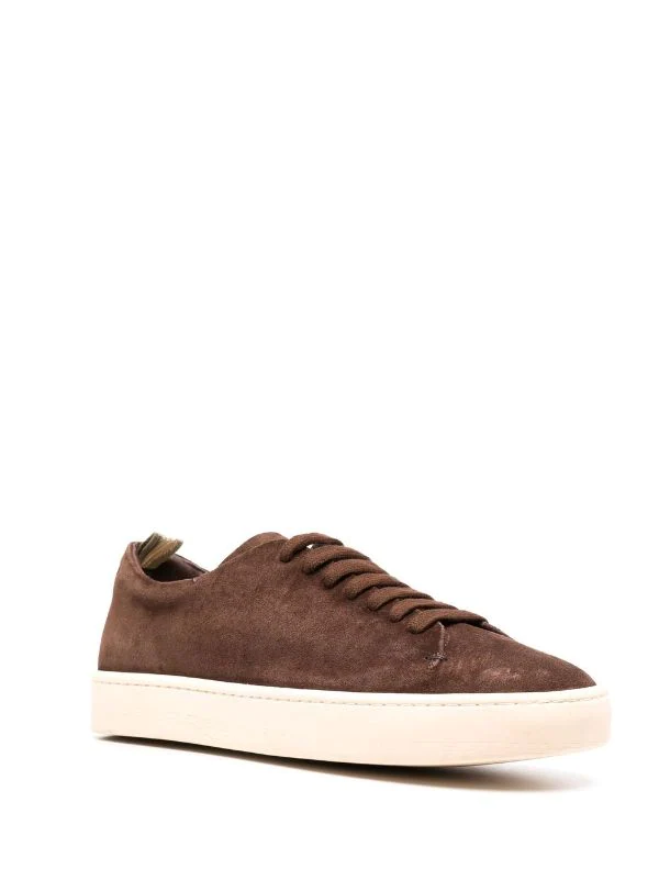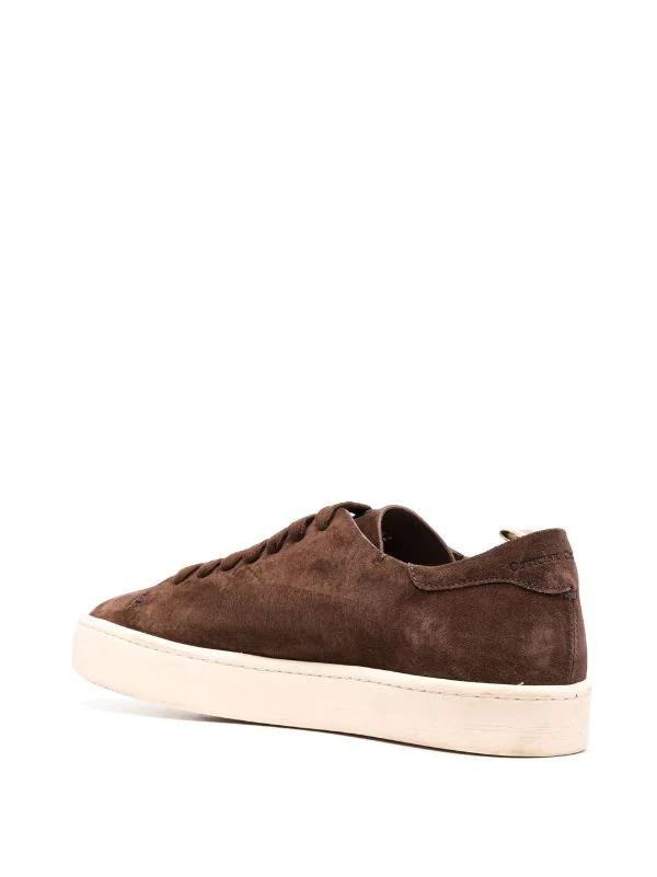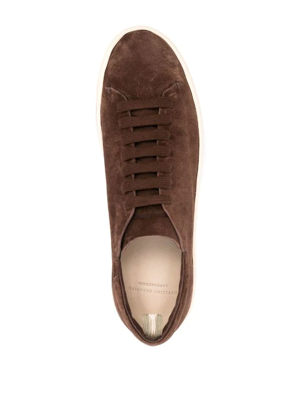 Chocolat, veau velours, bout rond, fermeture à lacer sur le devant, semelle plate en caoutchouc.