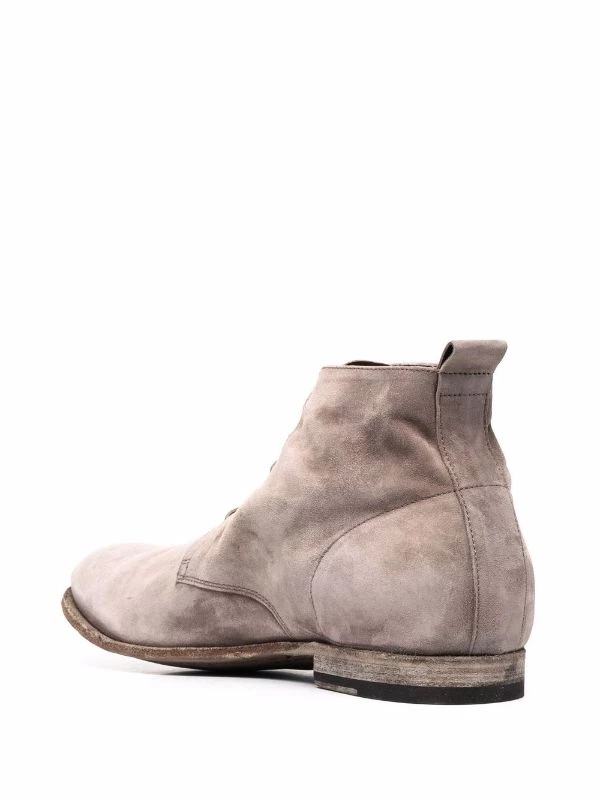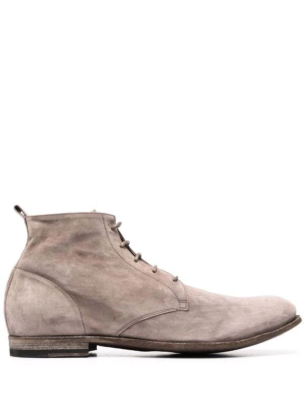 Bout en amande, fermeture à lacer sur le devant, languette d’enfilage au talon, semelle plate en cuir, hauteur cheville.
