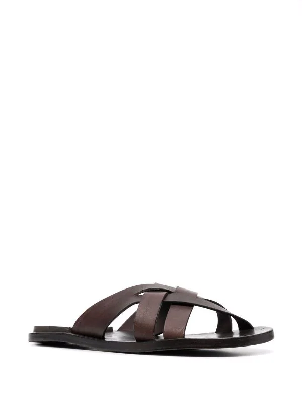 Semelle plate en cuir, bout ouvert, détail de brides croisées, design à enfiler. Matière : cuir de veau.