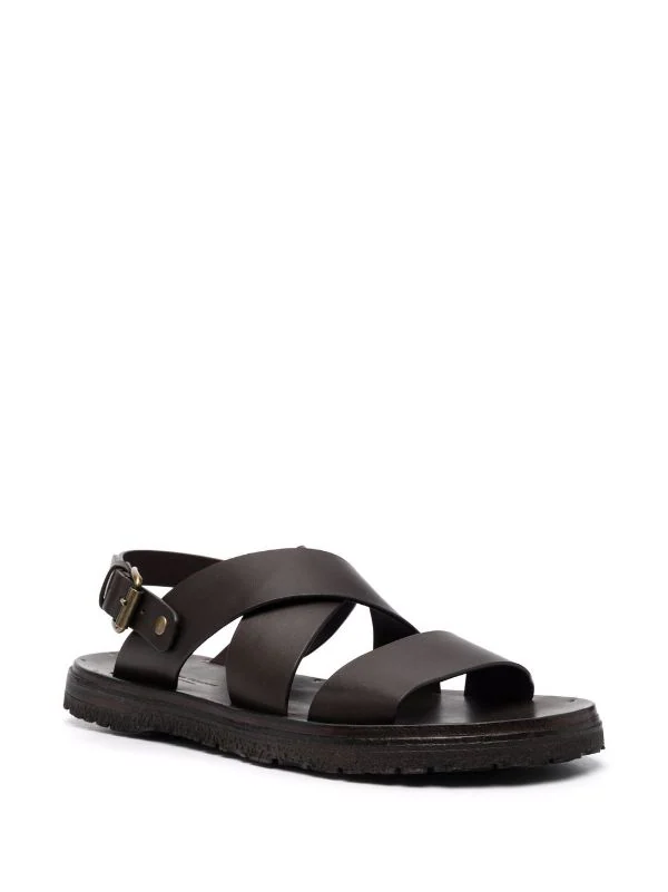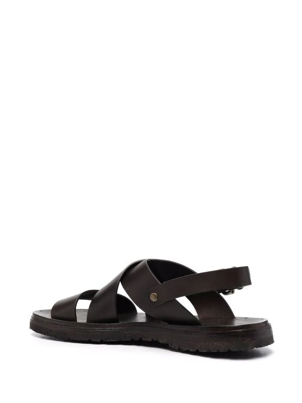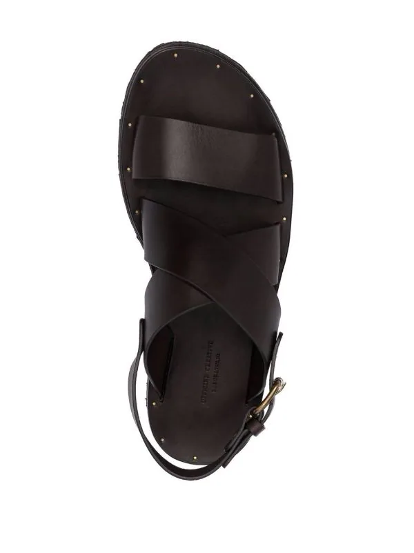 Détails de brides, bout ouvert, bride arrière à boucle, semelle intérieure à logo, semelle crantée en caoutchouc. Matière : cuir de veau.