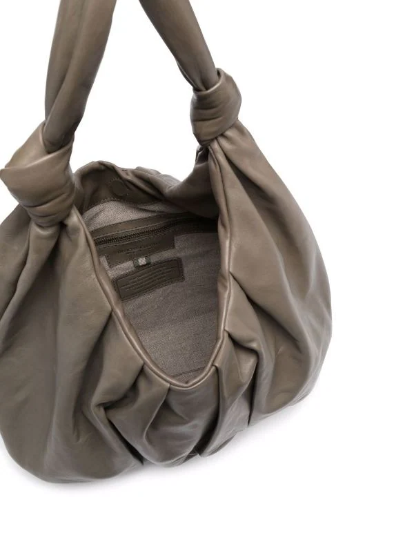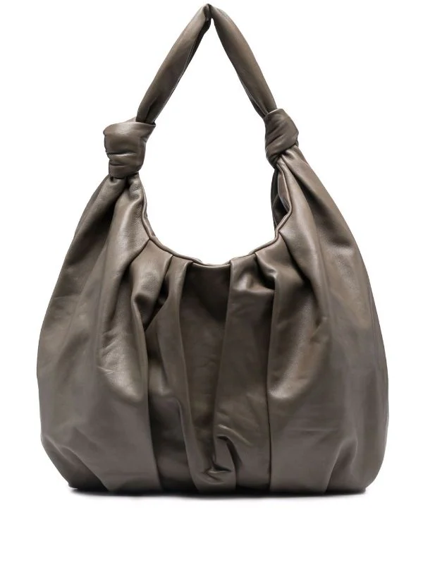 Anse plate sur le dessus, détail de nœud, détails de fronces, fini mat, fermeture magnétique dissimulée, compartiment principal, poche intérieure zippée, patch logo intérieur. Couleur : vert. Matière : cuir.
