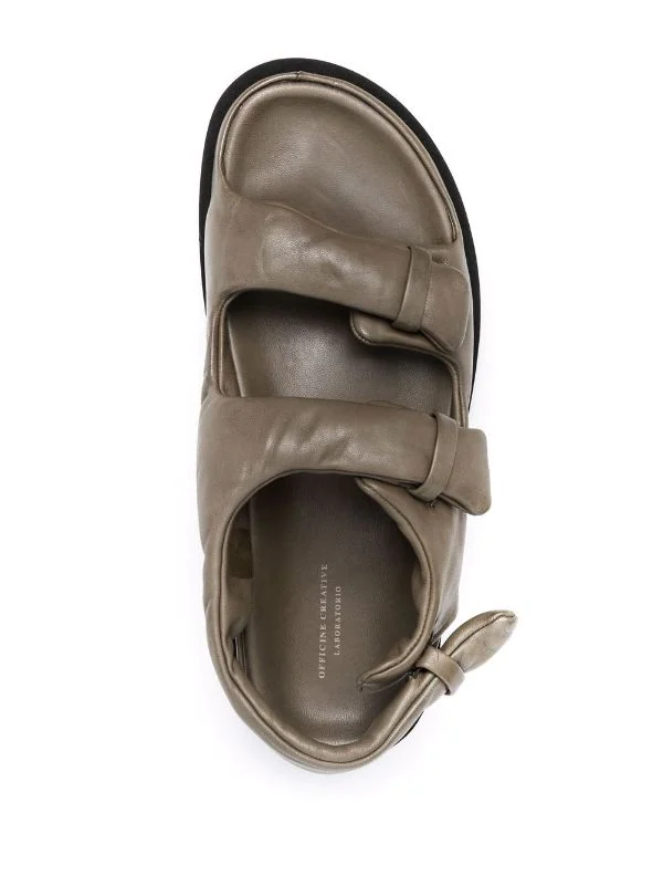 Semelle plate en caoutchouc, design matelassé, bride arrière, fermeture scratch sur le devant, bout ouvert. Couleur : vert. Matière : cuir de veau.
