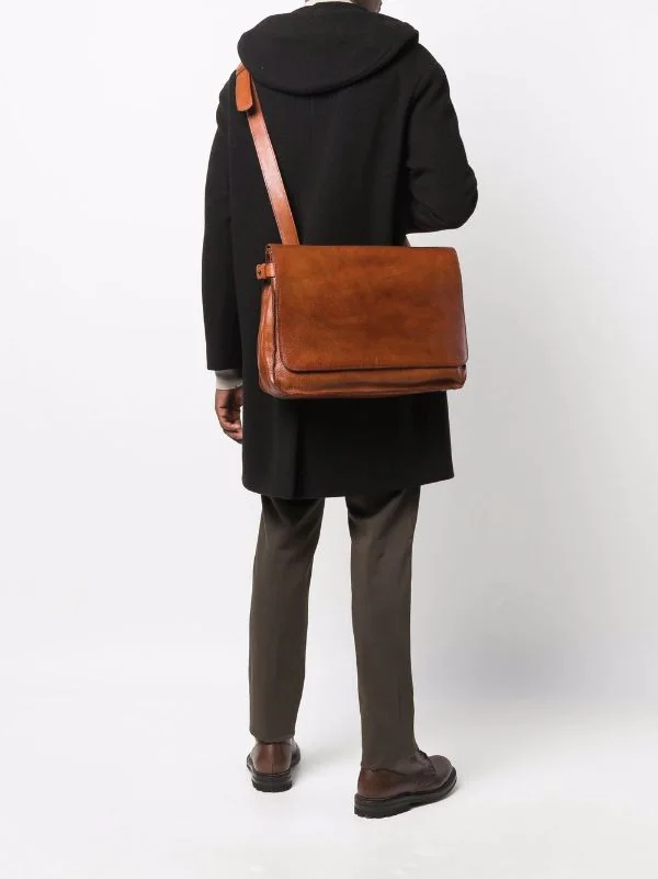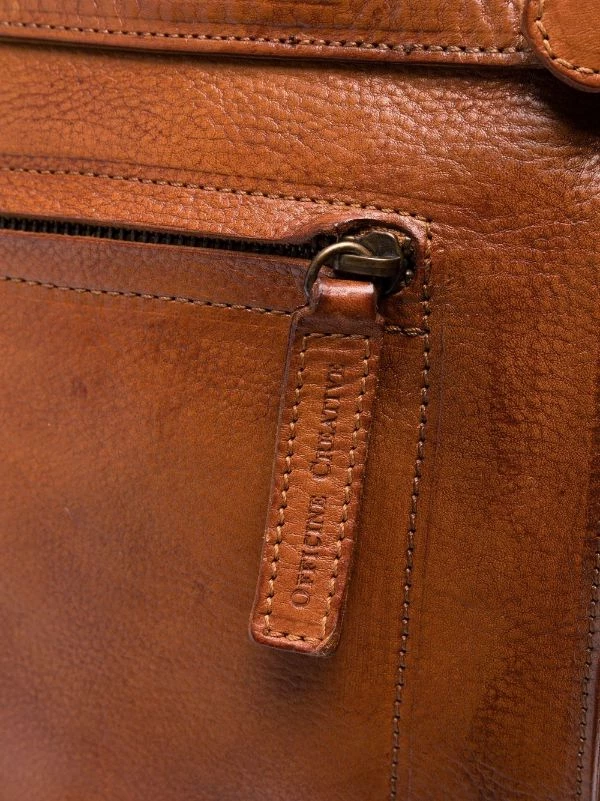 Effet usé, poche arrière zippée, rabat sur le dessus, compartiment principal, poches intérieures zippées, poche intérieure plaquée, bride porté épaule ajustable. Couleur : marron. Matière : cuir de veau.
