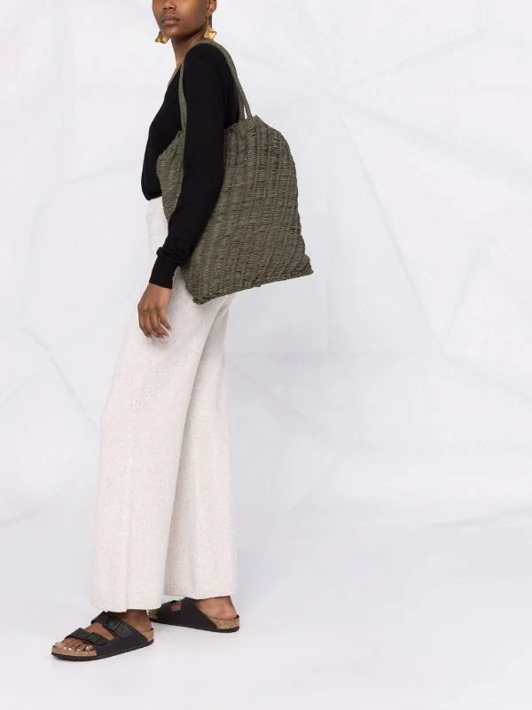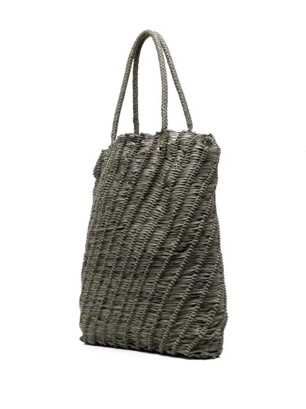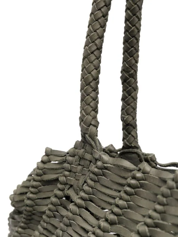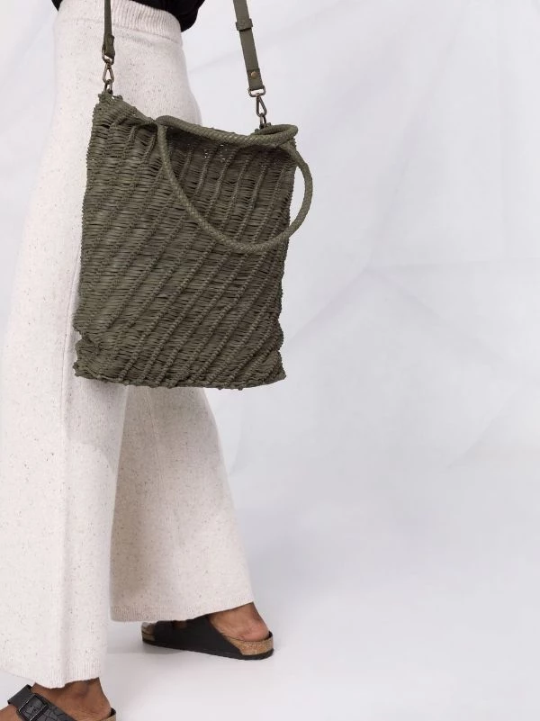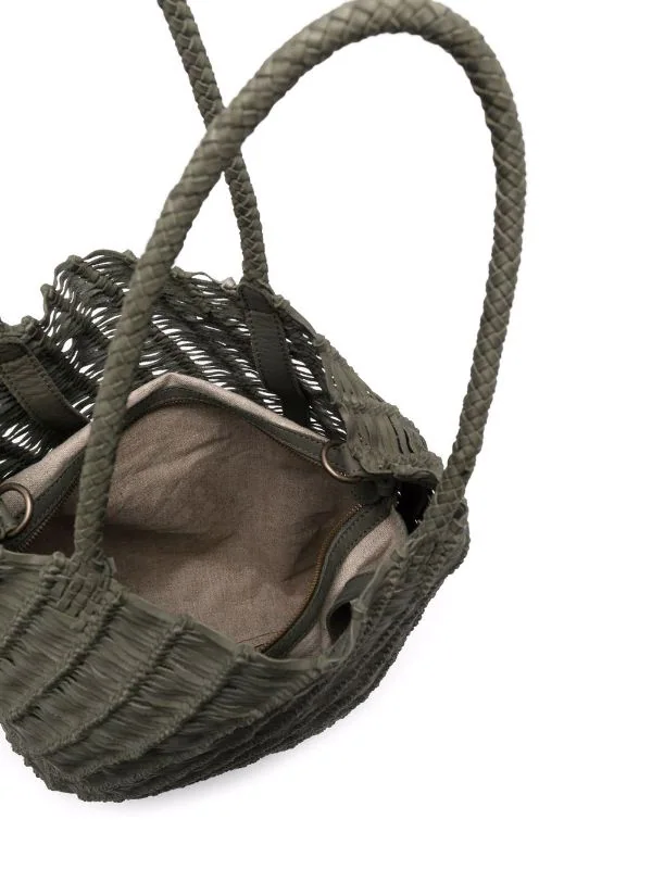 Anses arrondies, bride porté épaule détachable, design tissé, ouverture sur le dessus, fermeture zippée sur le dessus, compartiment principal. Couleur : vert. Matière : cuir de veau.