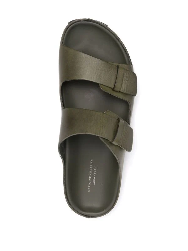 Détail de brides croisées, fermeture à boucles sur les côtés, design à enfiler, bout ouvert, semelle plate en caoutchouc. Matière : cuir de veau.