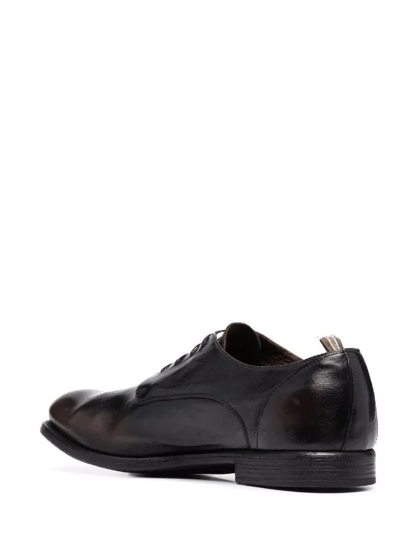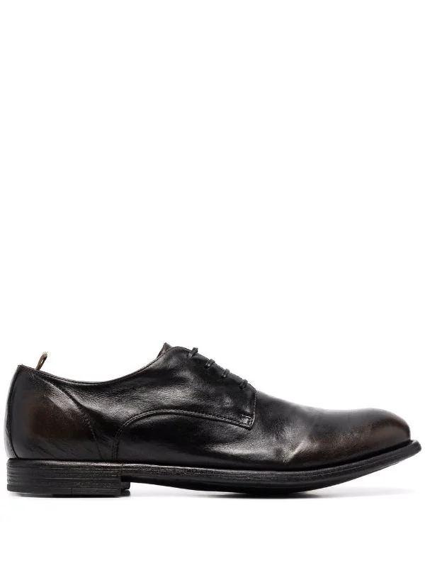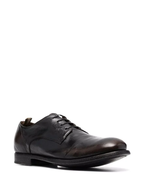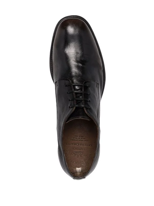 Semelle plate en caoutchouc, fermeture à lacer sur le devant, bout rond. Couleur : noir. Matière : cuir de buffle.