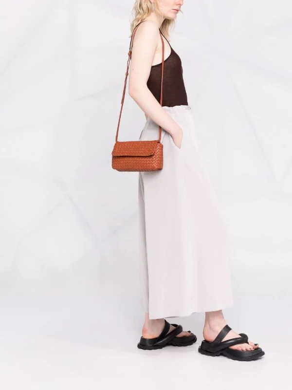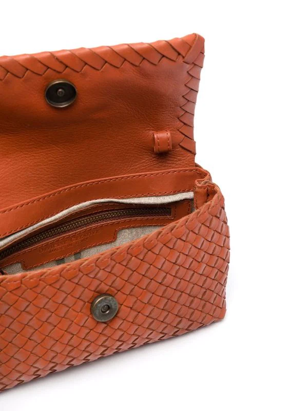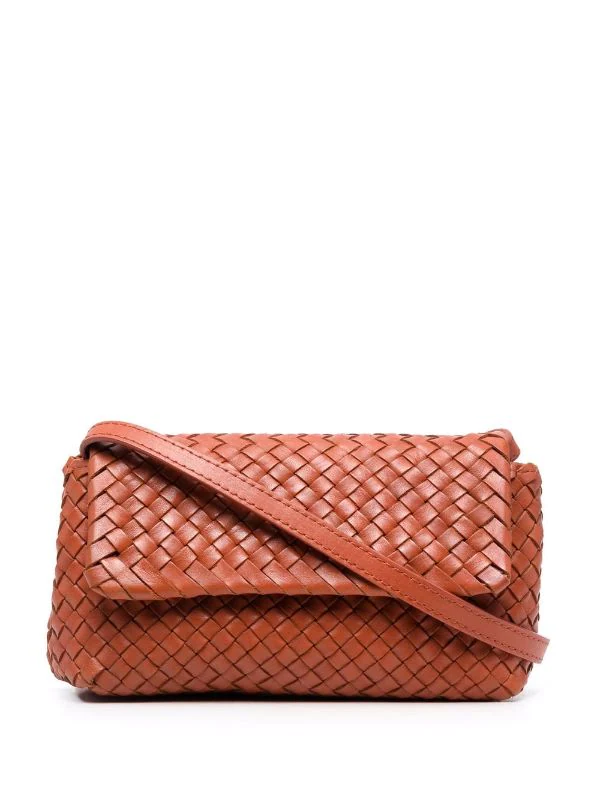 Design tissé, bride porté épaule ajustable, rabat sur le dessus à fermeture magnétique, poche intérieure zippée. Couleur : marron. Matière : cuir.