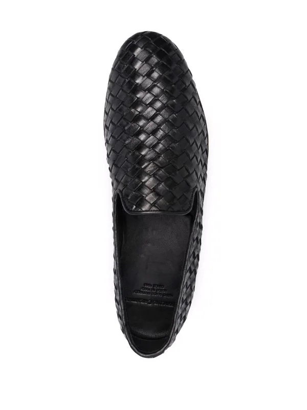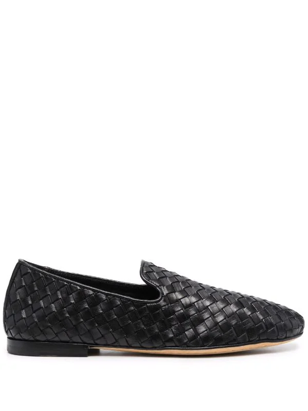 Design tissé, design à enfiler, bout en amande, semelle intérieure griffée, semelle plate, petit talon épais. Couleur : noir. Matière : cuir.