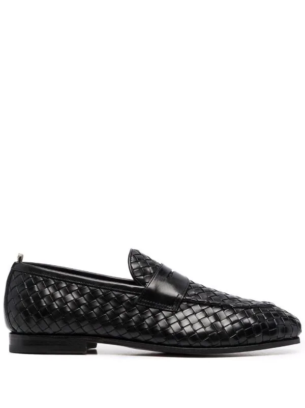 Lanière tressée, entaille penny, bout rond, semelle intérieure griffée, petit talon épais. Couleur : noir. Matière : cuir.