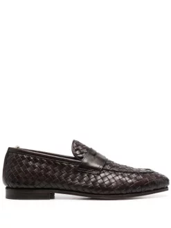 Design à enfiler, design tissé, entaille penny, bout en amande, semelle intérieure griffée, semelle plate en caoutchouc. Couleur : marron.