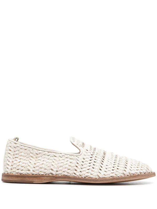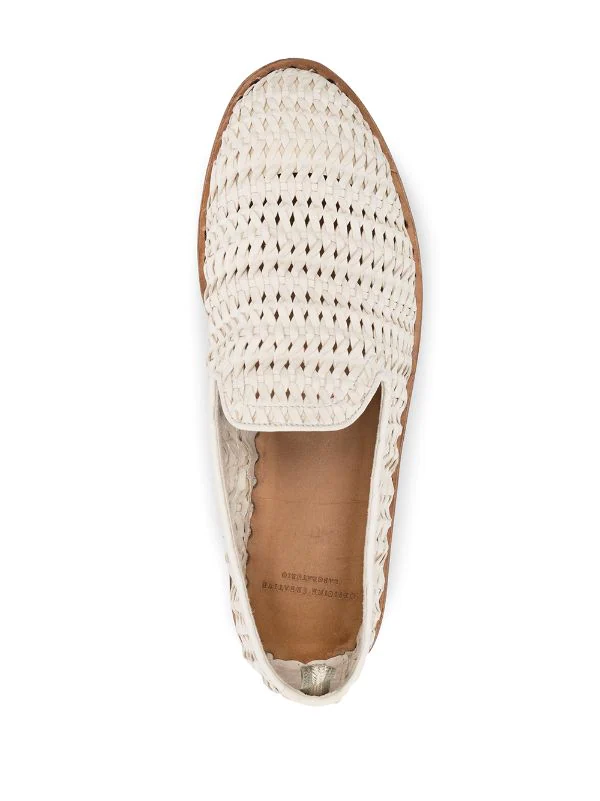 Bout en amande, design en osier tressé, languette d’enfilage au talon, semelle intérieure griffée, petit talon bottier. Matière : cuir de veau.