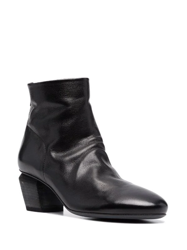 Hauteur cheville, bout rond, fermeture zippée à l’arrière, talon mi-haut. Couleur : noir. Matière : cuir.