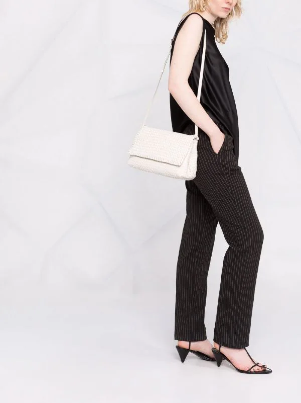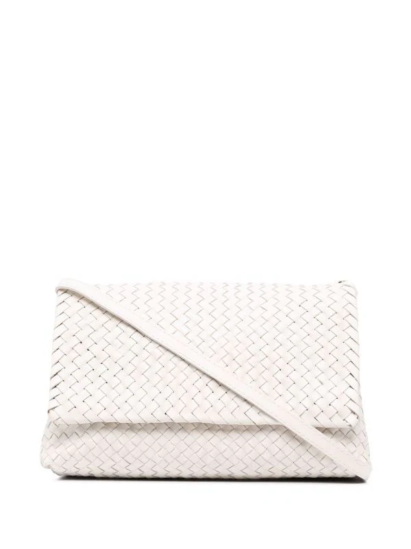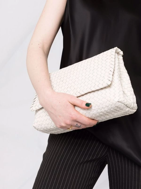 Design tissé, rabat sur le dessus à fermeture magnétique, poches intérieures zippées. Couleur : blanc. Matière : cuir de veau.