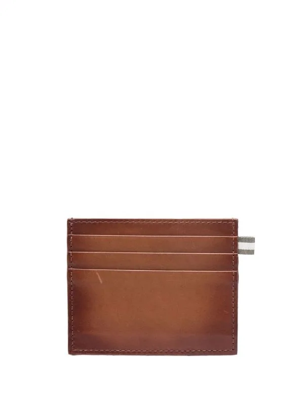 Forme rectangulaire, logo embossé sur le devant, fentes pour carte. Matière : cuir de veau.