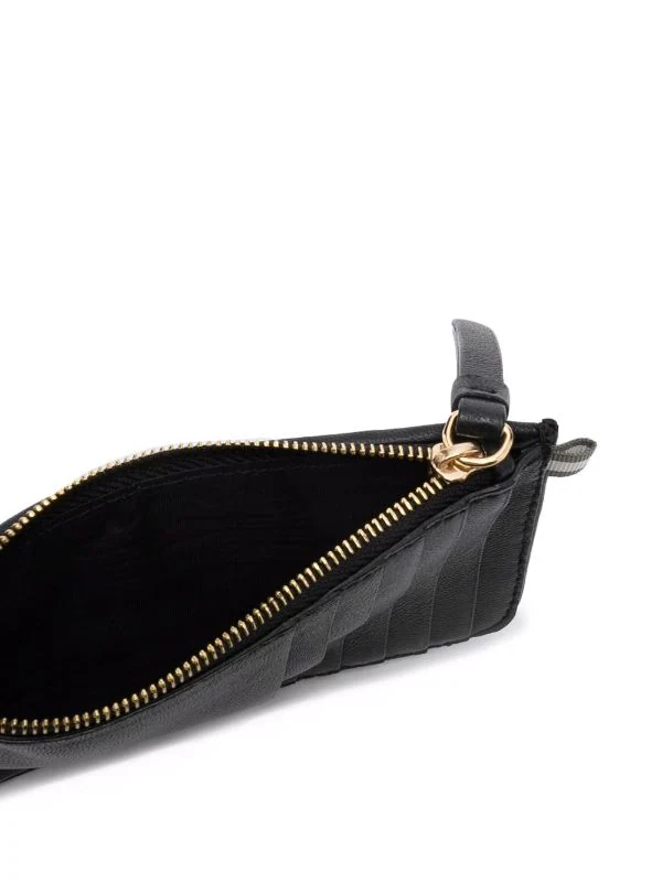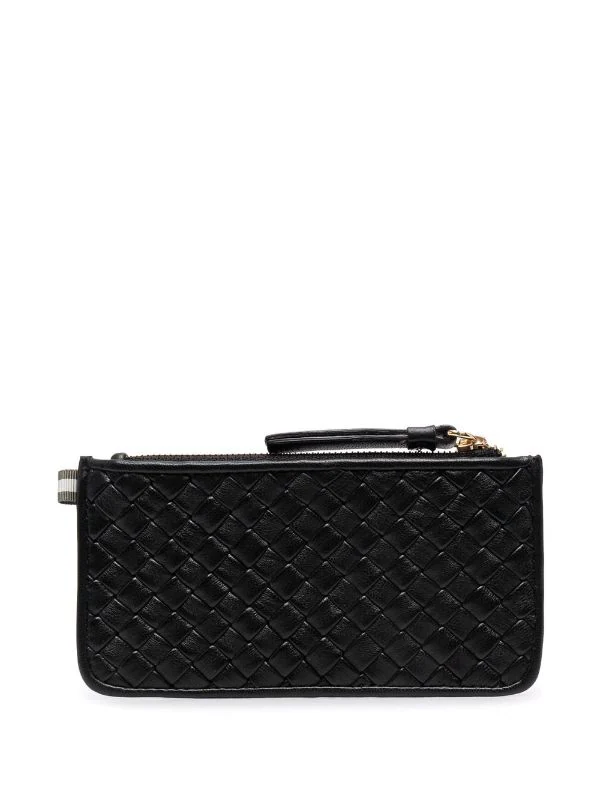 Design tissé, languette signature en gros-grain, logo imprimé à l’arrière, compartiment zippé, fentes pour cartes à l’arrière. Couleur : noir. Matière : cuir de veau.