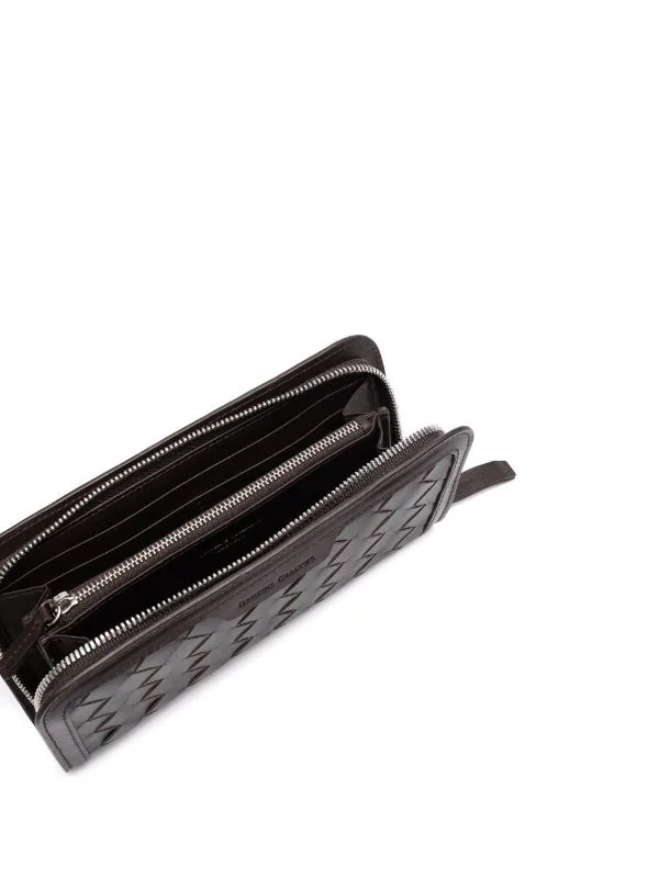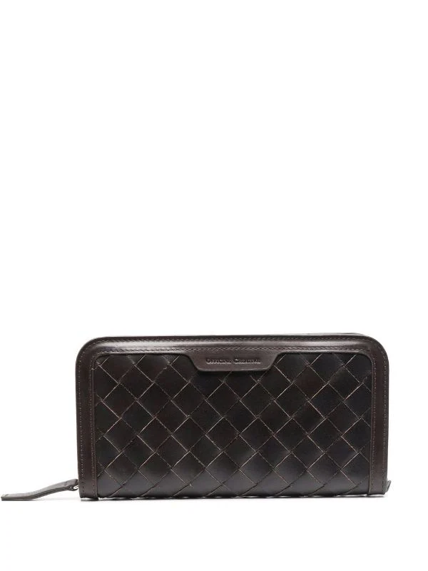 Logo embossé sur le devant, design tissé, fermeture zippée tout autour, compartiment intérieur, compartiments intérieurs pour carte, poches intérieures zippées. Matière : cuir.