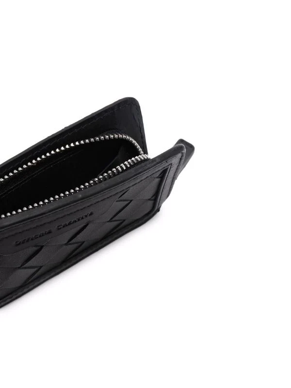 Logo embossé sur le devant, fermeture zippée tout autour, compartiments intérieurs pour carte. Couleur : noir. Matière : cuir de veau.