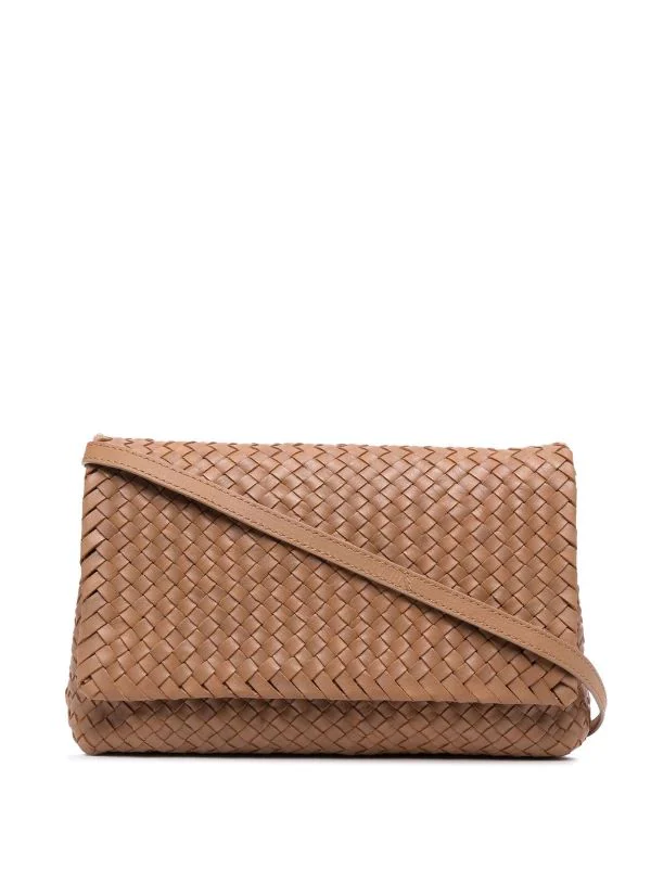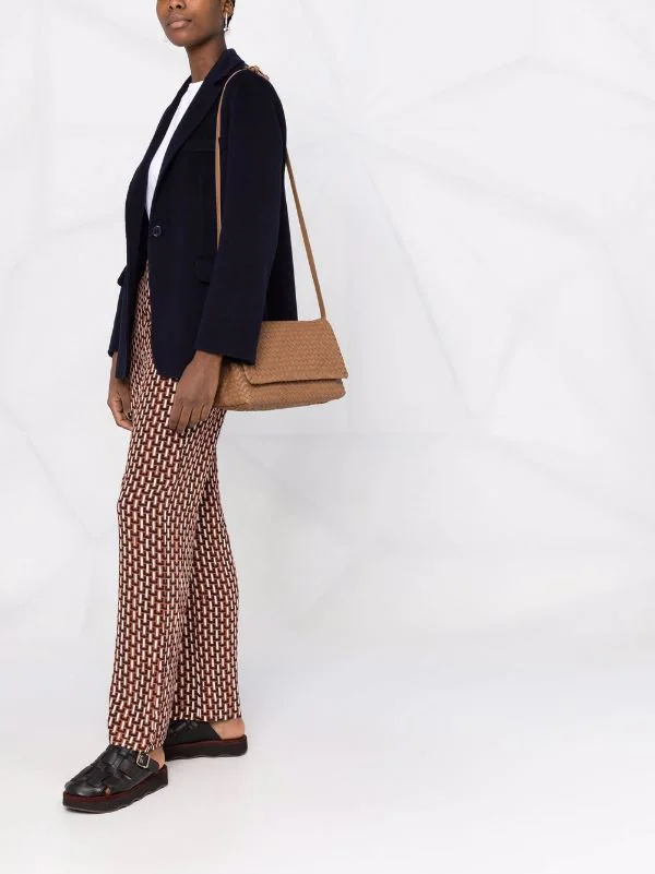 Design tissé, rabat sur le devant, fermeture magnétique, poches intérieures zippées, bride porté épaule détachable et ajustable. Couleur : marron. Matière : cuir.