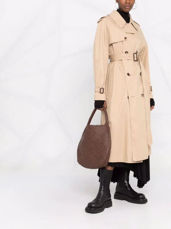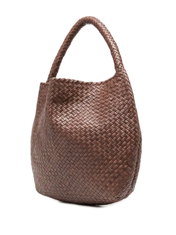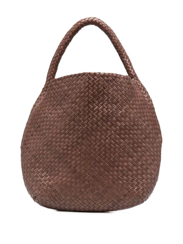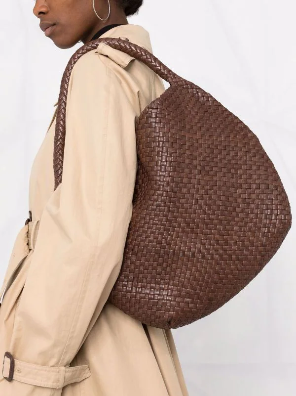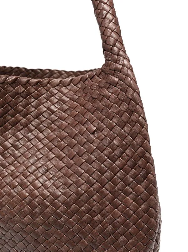 Design tissé, anse classique, ouverture sur le dessus, pochette détachable. Couleur : marron. Matière : cuir.