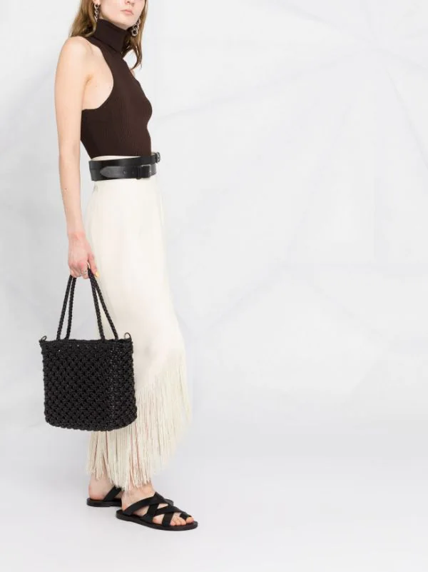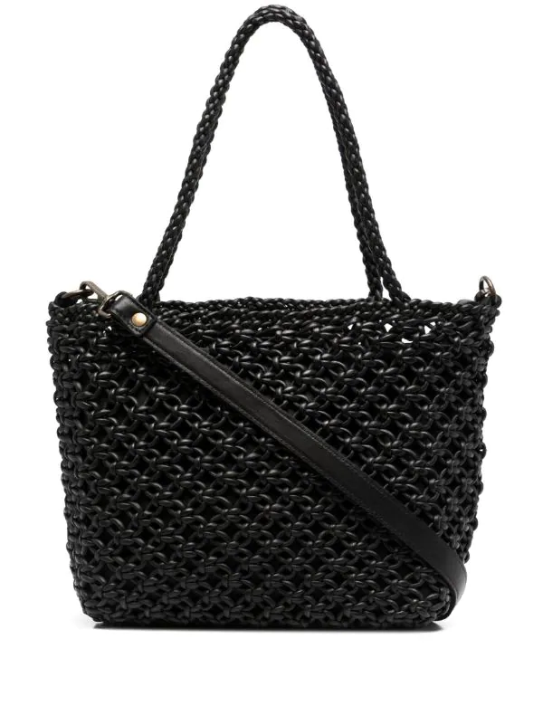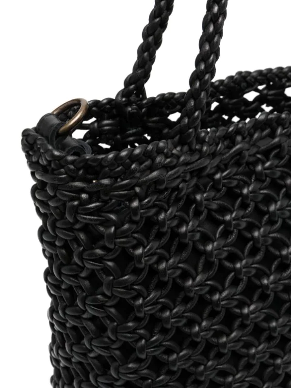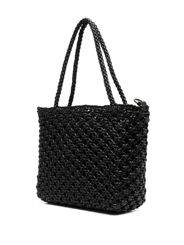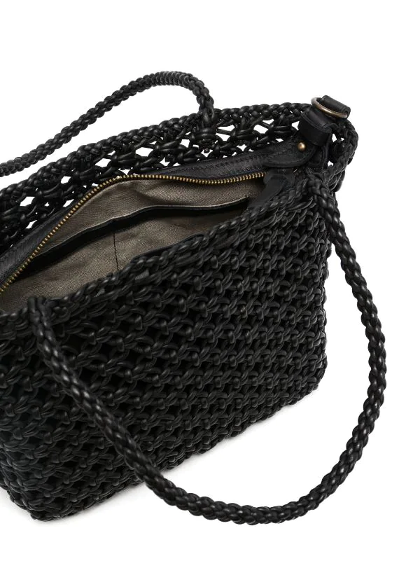 Lanière tressée, anses arrondies, fermeture zippée sur le dessus, bride porté épaule ajustable. Couleur : noir. Matière : cuir de veau.