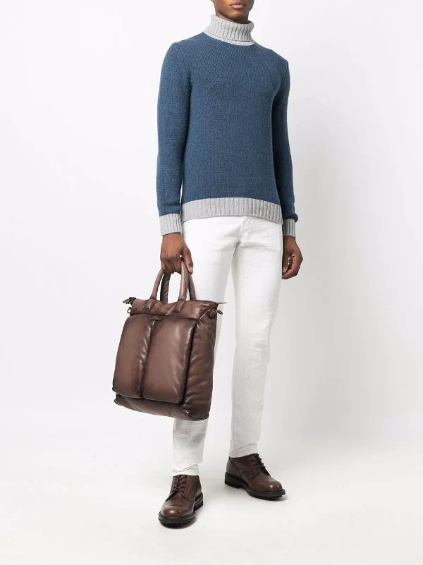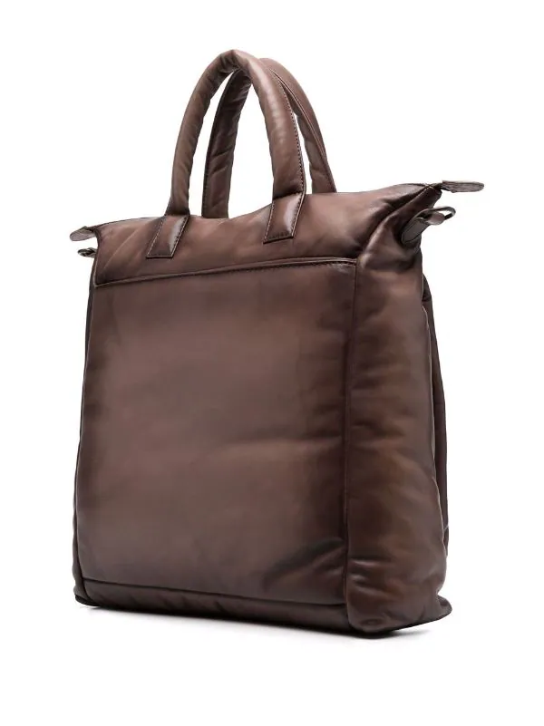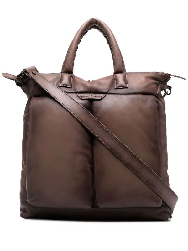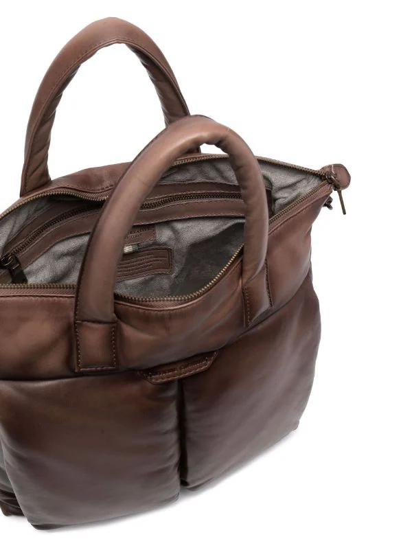 Anses sur le dessus, bride porté épaule détachable et ajustable, fermeture zippée sur le dessus, poche intérieure zippée. Couleur : marron. Matière : cuir de veau.