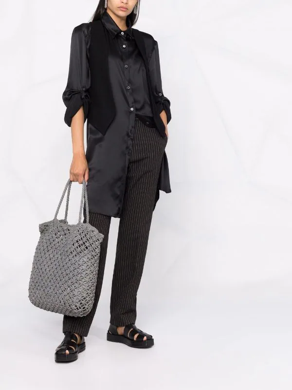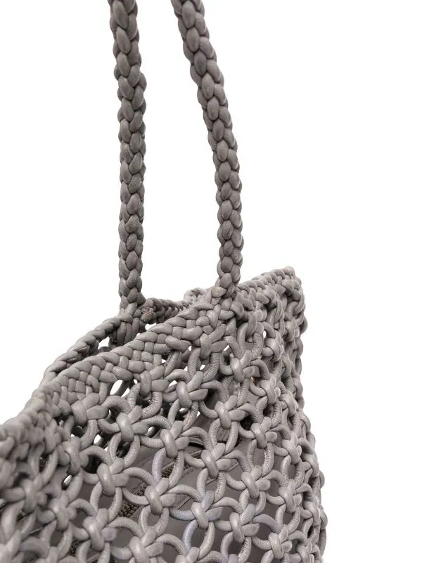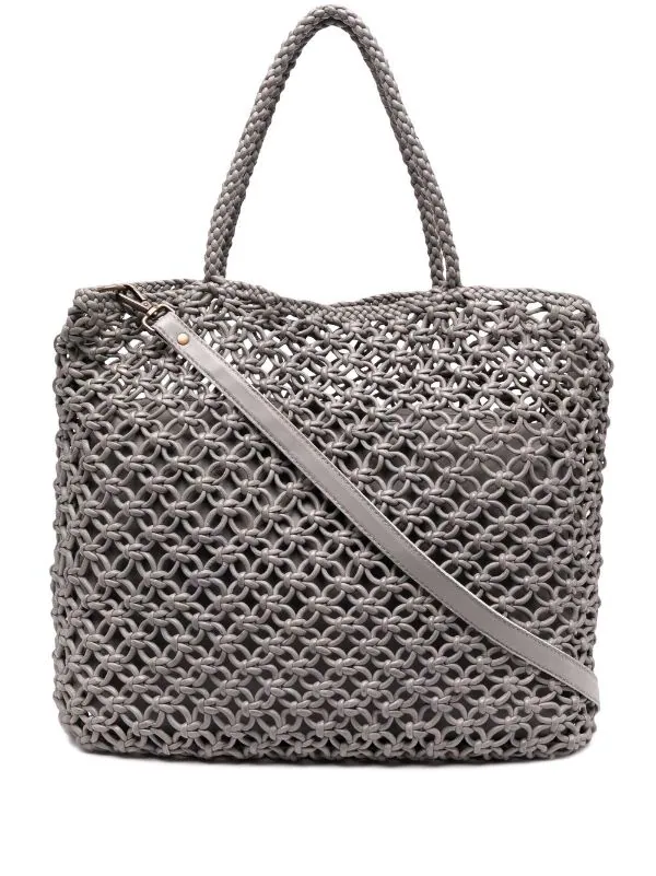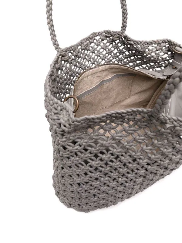 Finitions en macramé, anses sur le dessus, fermeture zippée sur le dessus, plusieurs poches intérieures plaquées. Matière : cuir.