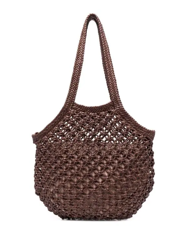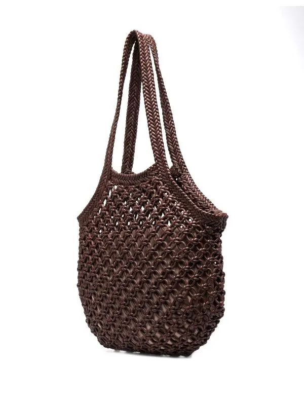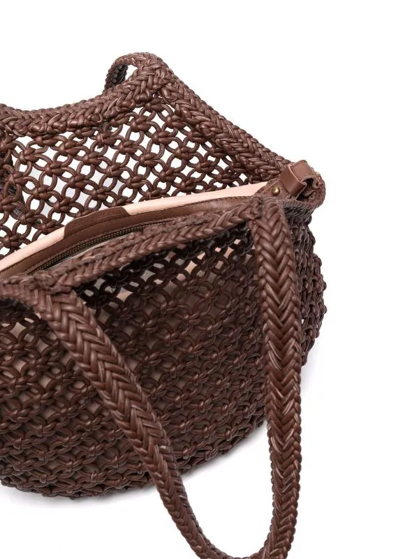 Effet de transparence, design tissé, anses sur le dessus, fermeture zippée sur le dessus, compartiment principal. Couleur : marron. Matière : cuir de veau.