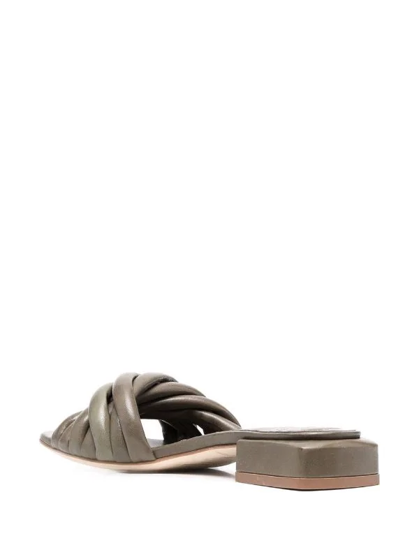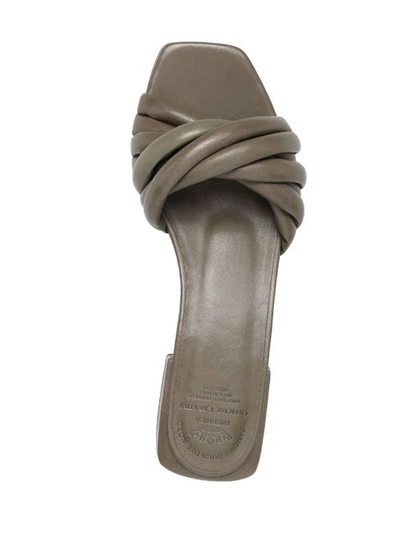 Petit talon bottier, détail torsadé, design à enfiler, bout ouvert. Couleur : vert. Matière : cuir de veau.