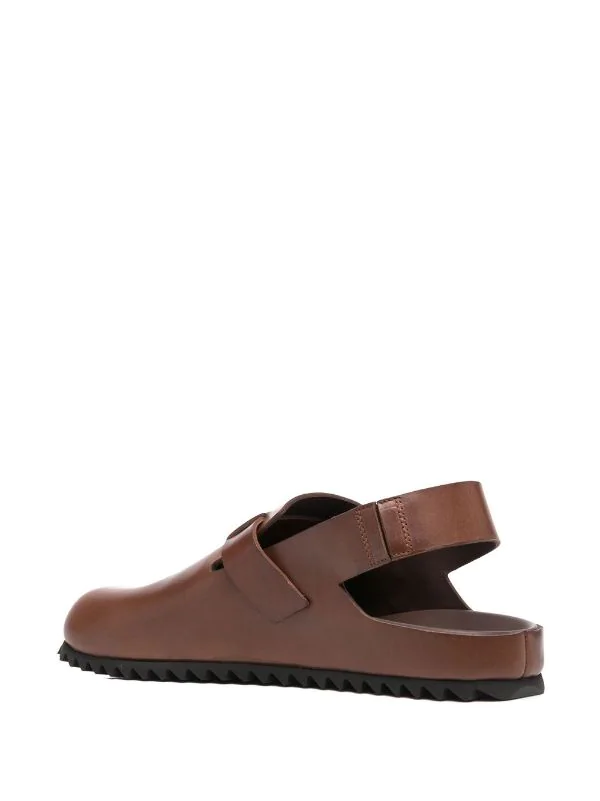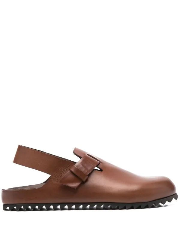 Chocolat, design à enfiler, bride arrière, bout en amande, semelle crantée en caoutchouc, semelle intérieure griffée. Matière : cuir de veau.