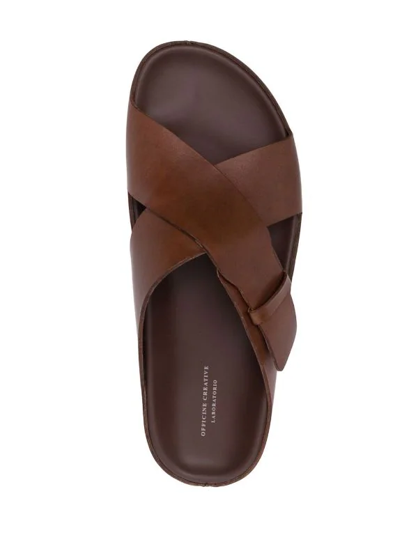 Brides croisées aux orteils, bout ouvert, dos-nu, design à enfiler, semelle intérieure à logo, semelle crantée en caoutchouc. Matière : cuir de veau.