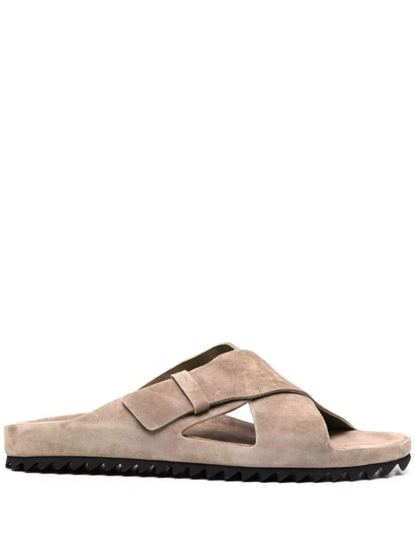 Brides croisées aux orteils, bout ouvert, dos-nu, design à enfiler, semelle crantée en caoutchouc. Matière : chèvre velours.