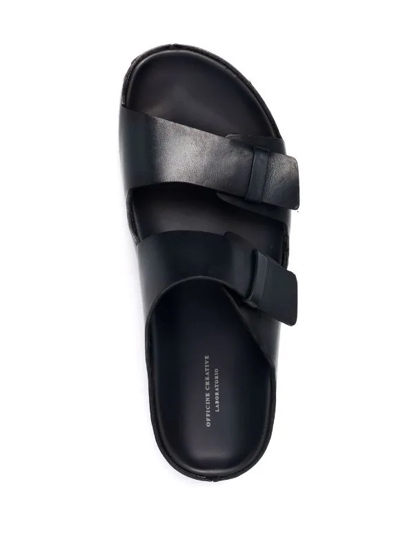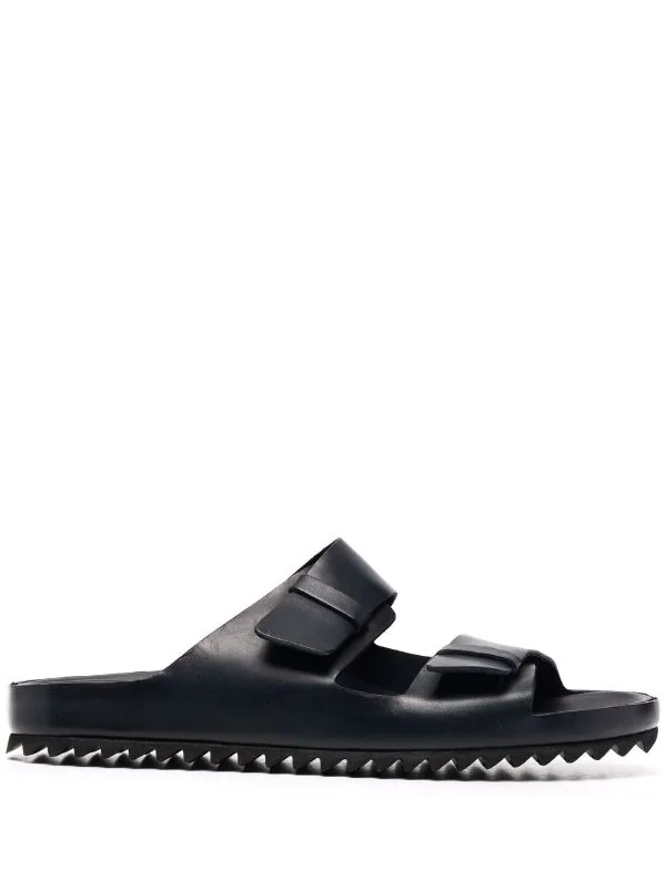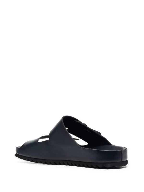 Design double-tour, bout ouvert, semelle intérieure à logo, semelle plate en caoutchouc. Couleur : noir. Matière : cuir de veau.