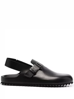Bout rond, bride arrière, taille ajustable, semelle crantée en caoutchouc. Couleur : noir. Matière : cuir de veau.
