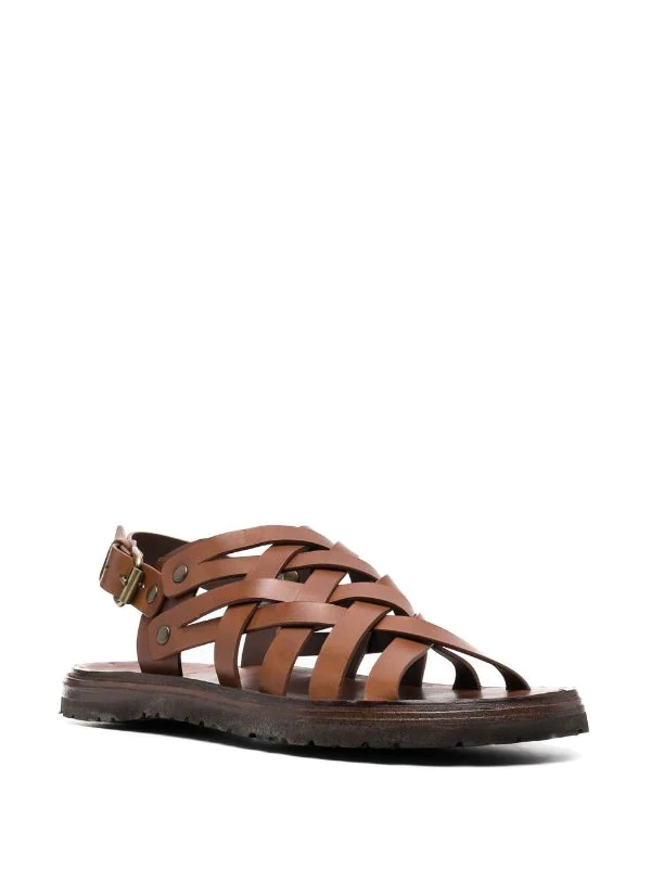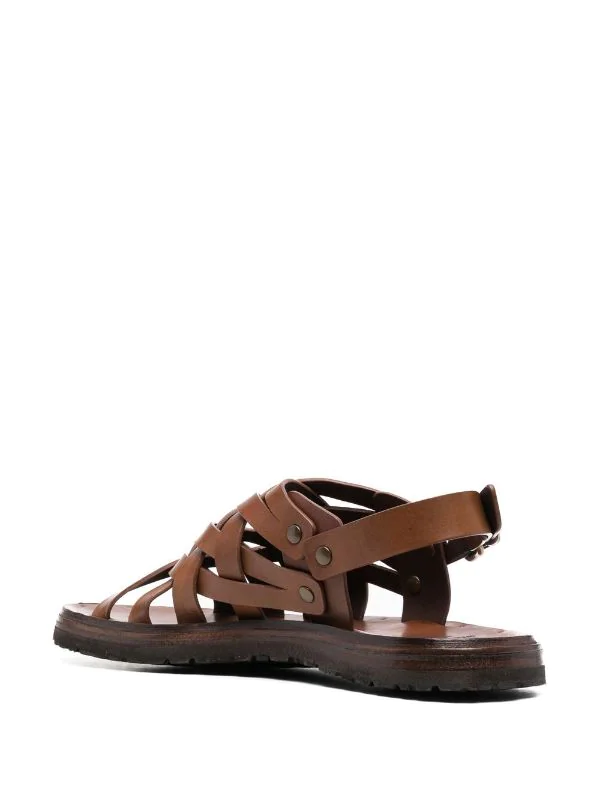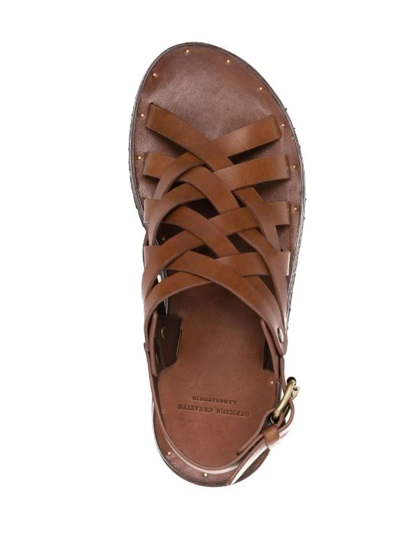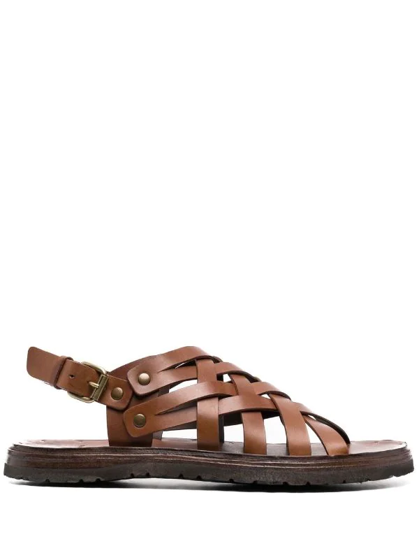Marron, cuir de veau, bout ouvert, brides croisées aux orteils, bride arrière à boucle, semelle plate en caoutchouc.