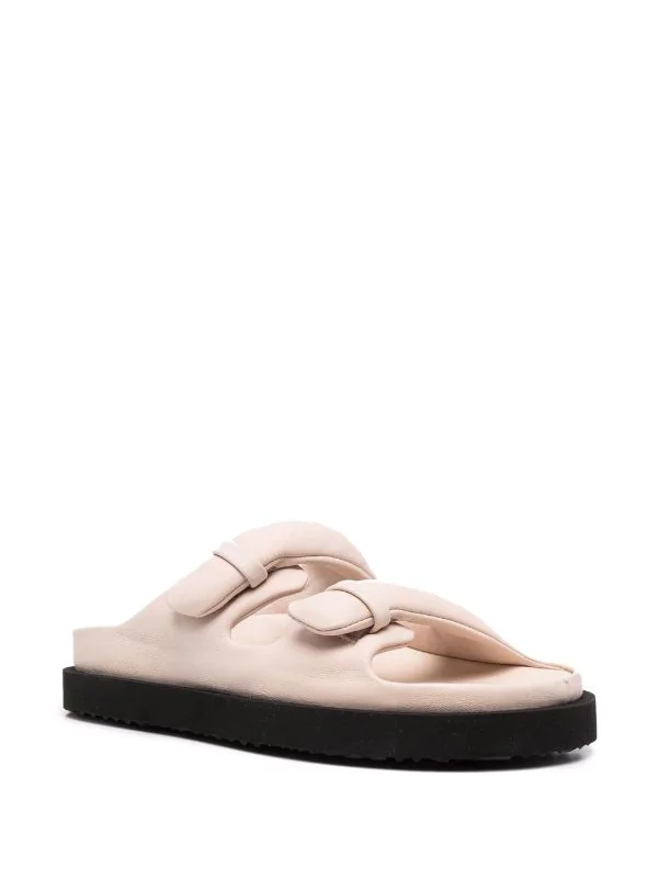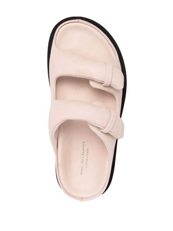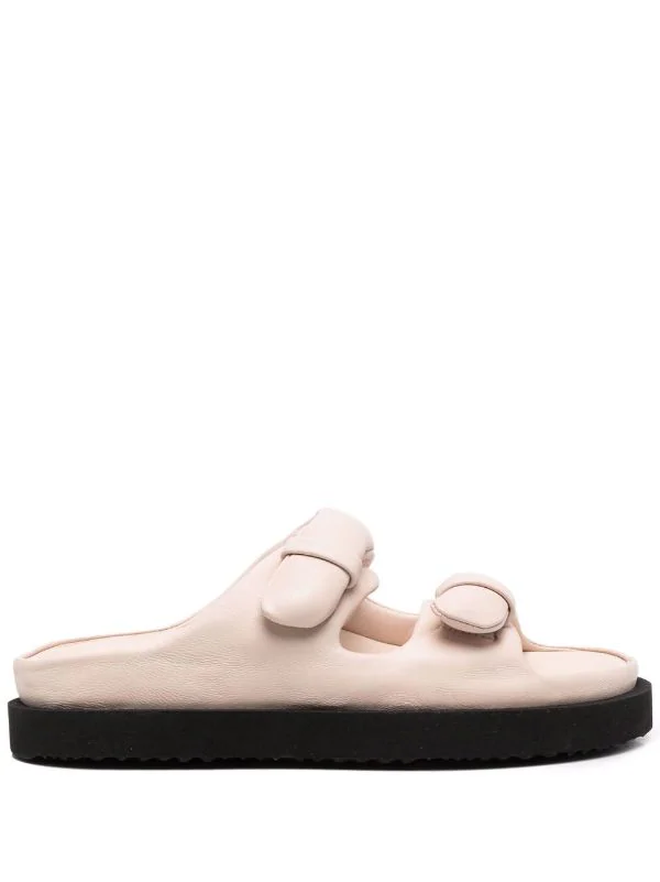 Design double-tour, bout ouvert, semelle plate en caoutchouc, design à enfiler. Matière : cuir de veau.