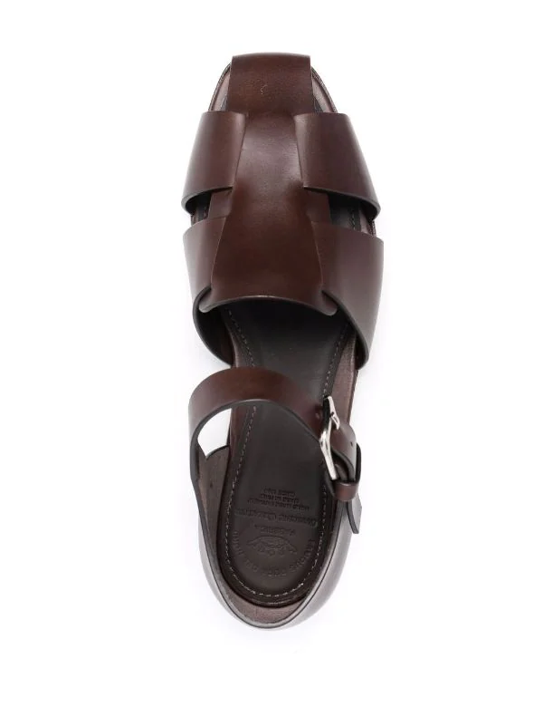 Détails de découpes, bout carré, fermeture à boucle, finitions en métal argenté, semelle intérieure à logo, semelle plate.