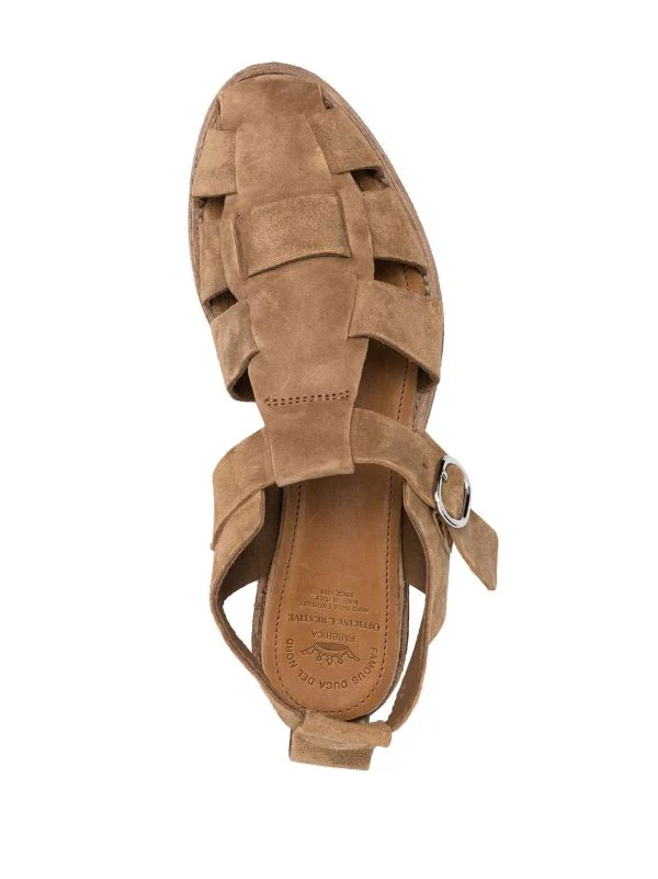 Fermeture à boucles sur les côtés, design à enfiler, bout rond, semelle plate en cuir, semelle intérieure à logo. Matière : cuir de buffle.