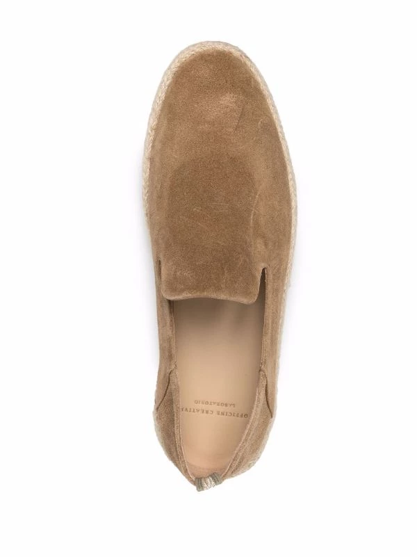 Bout rond, languette d’enfilage au talon, semelle intérieure à logo, semelle en raphia tressé.