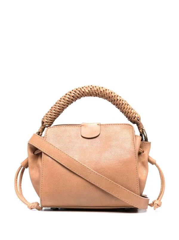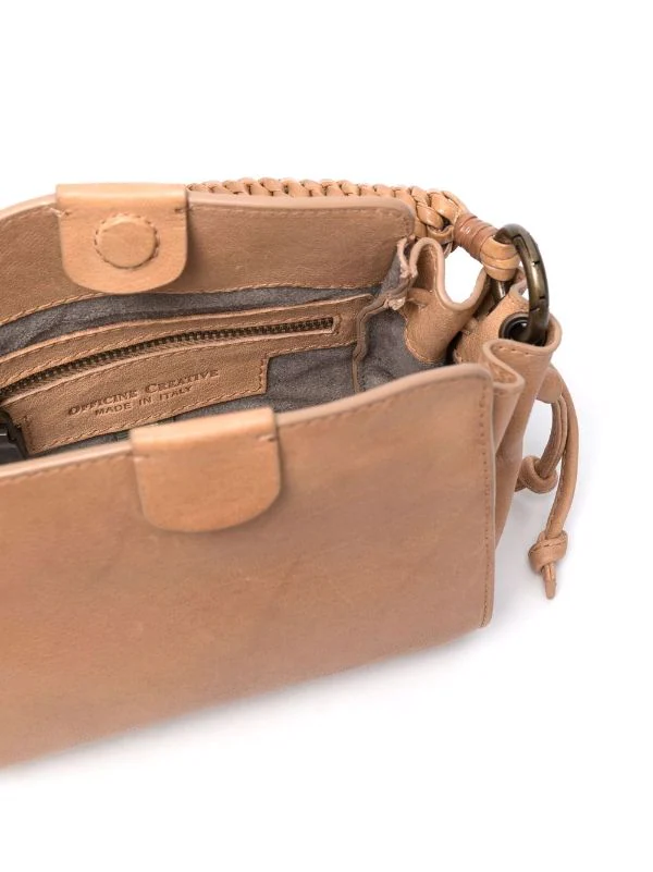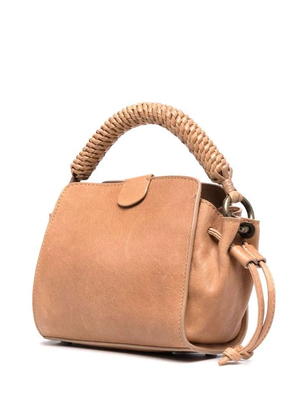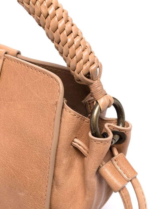 Anse tressée, fermeture à lien de resserrage sur le côté, fermeture magnétique, poches intérieures zippées, bride porté épaule détachable et ajustable. Matière : cuir.