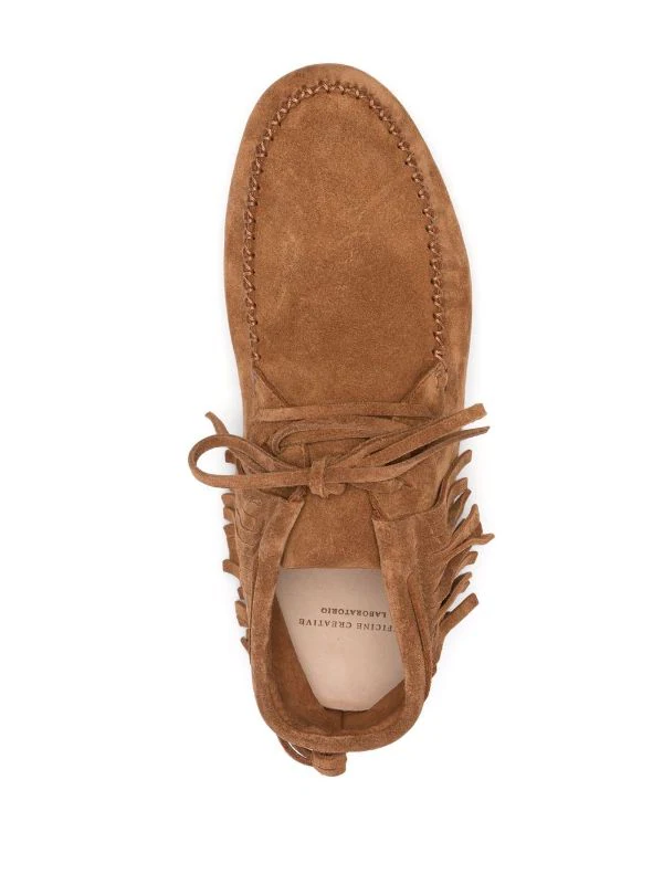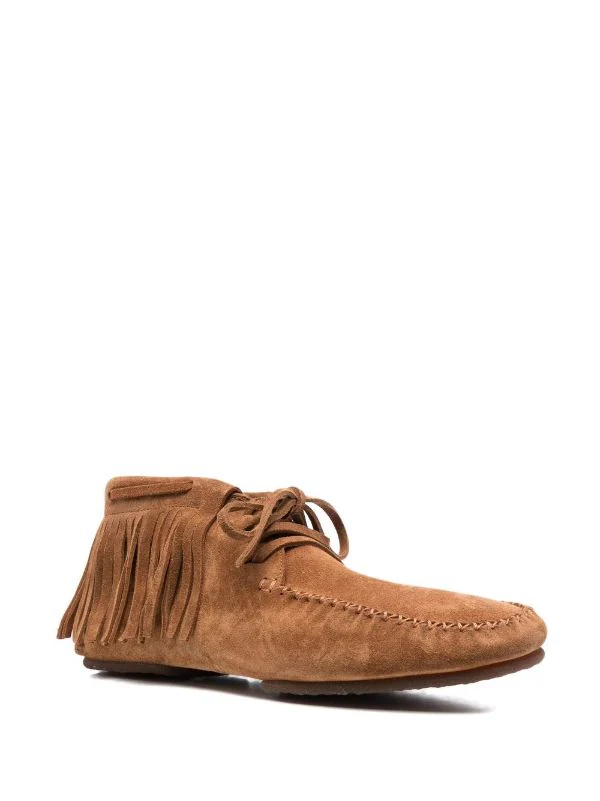 Semelle plate en caoutchouc, finition à franges, fermeture à lacer sur le devant, bout rond.