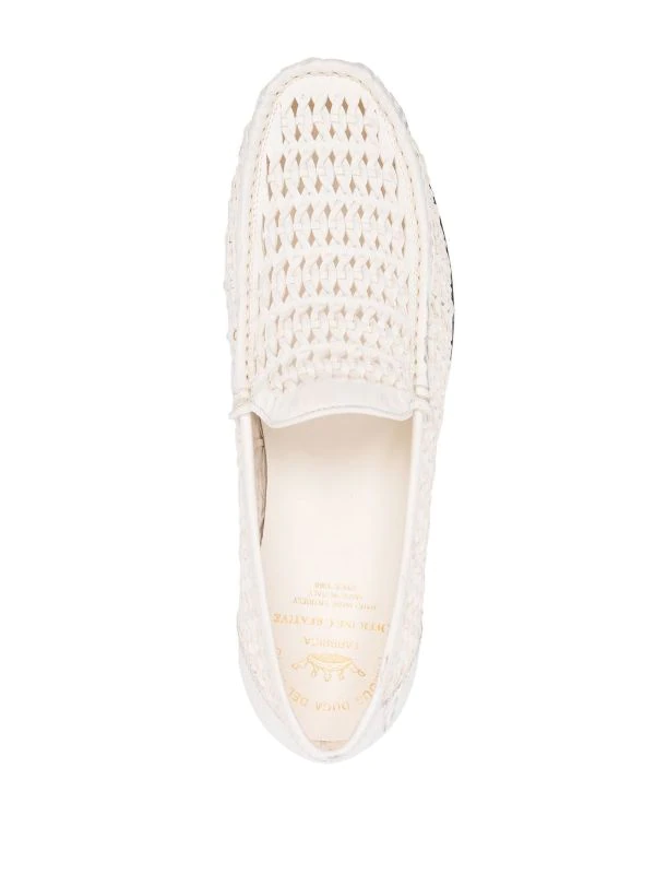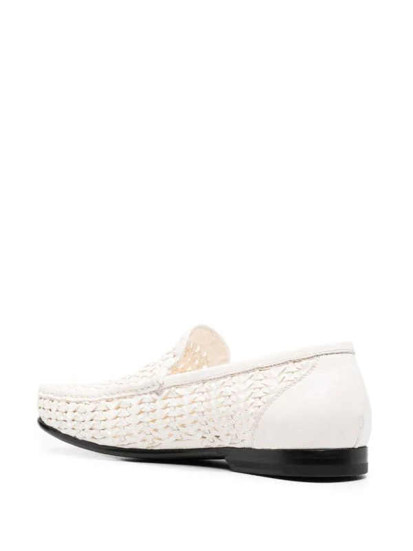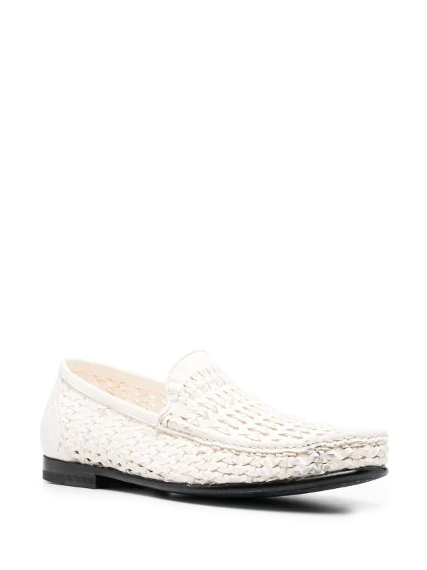 Blanc cassé, peau de cerf, design tissé, bout en amande, design à enfiler, semelle à épaisseurs superposées.