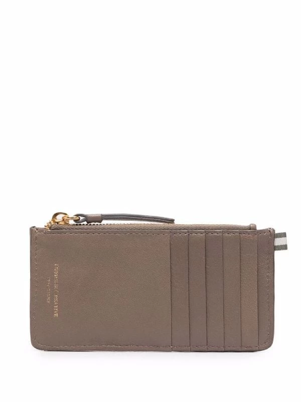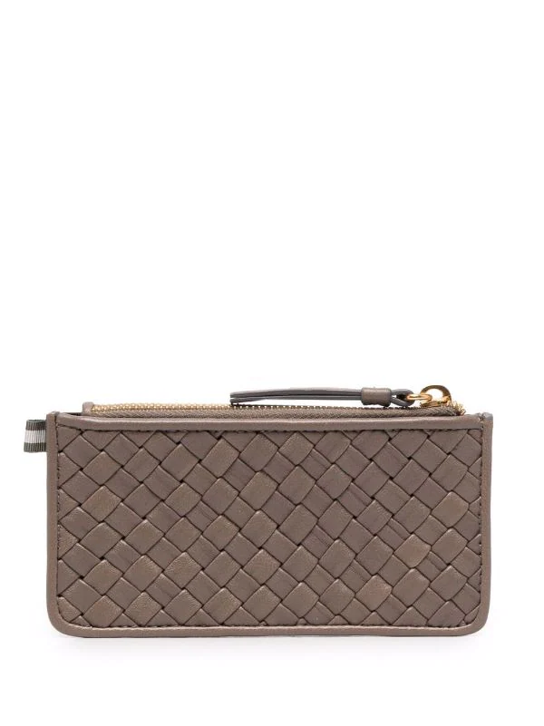 Design tissé, languette signature en gros-grain, logo imprimé à l’arrière, fentes pour cartes à l’arrière, poche zippée. Matière : cuir.