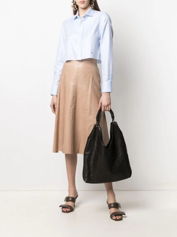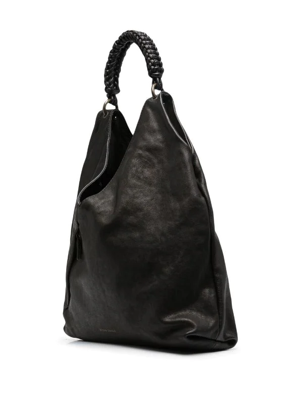 Texture grainée, bout ouvert, anse tressée, compartiment principal, poches intérieures zippées. Matière : cuir de veau.