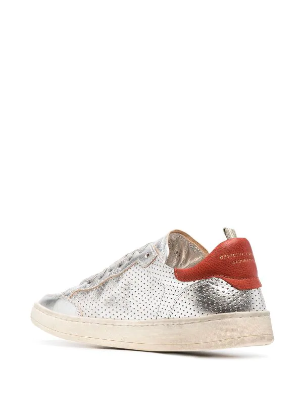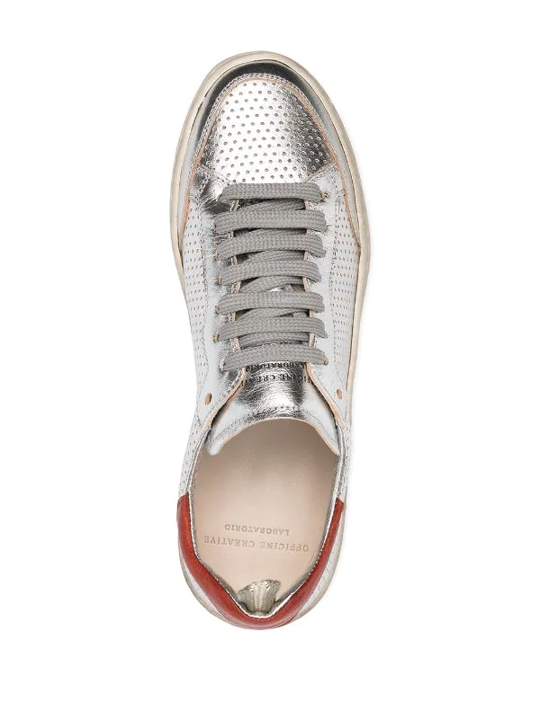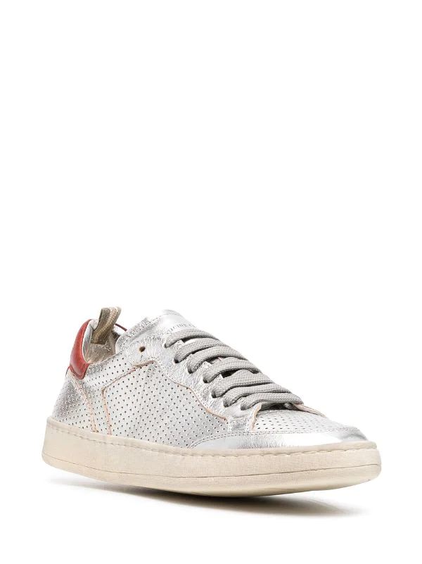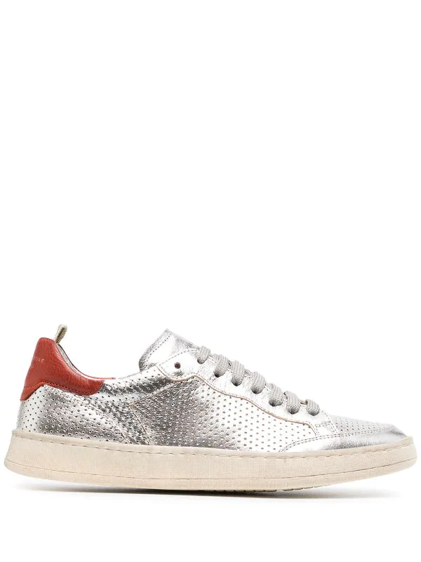 Fini métallisé, bout rond, fermeture à lacer sur le devant, semelle plate en caoutchouc, semelle intérieure à logo. Couleur : argent. Matière : cuir.