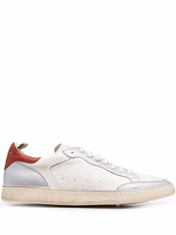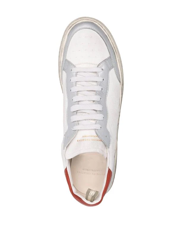 Design à empiècements colour block, semelle plate en caoutchouc, contrefort contrastant, fermeture à lacer sur le devant, bout rond. Matière : cuir de veau.