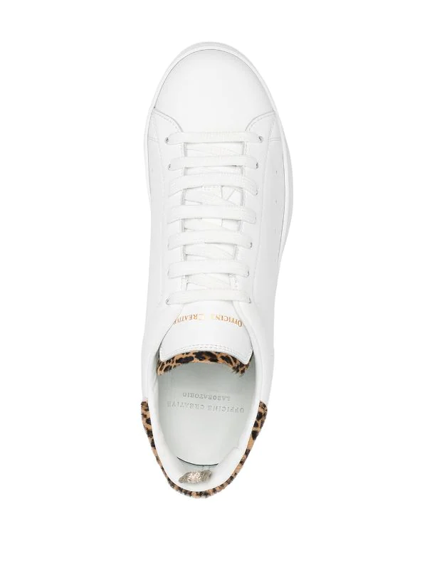 Détails de perforations, bout rond, languette à logo imprimé, semelle intérieure à logo, semelle plate. Matière : cuir.
