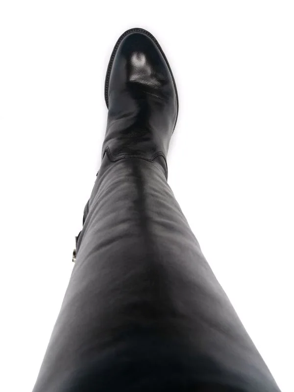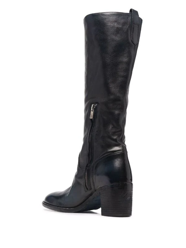 Fini poli, bout en amande, hauteur genou, languette d’enfilage au talon, fermeture zippée sur le côté, petit talon épais. Matière : cuir.