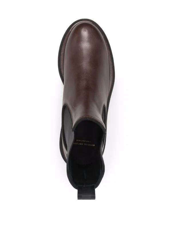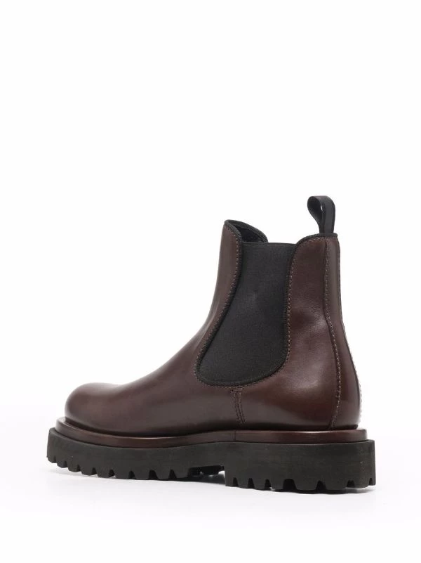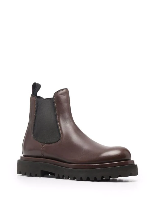Empiècements élastiqués sur les côtés, languette d’enfilage au talon, bout rond, hauteur cheville, design à enfiler, semelle crantée en caoutchouc. Matière : cuir.