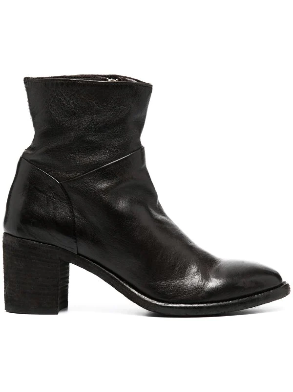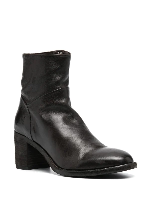 Bout en amande, fermeture zippée sur les côtés, talon épais, longueur cheville. Matière : cuir de buffle.